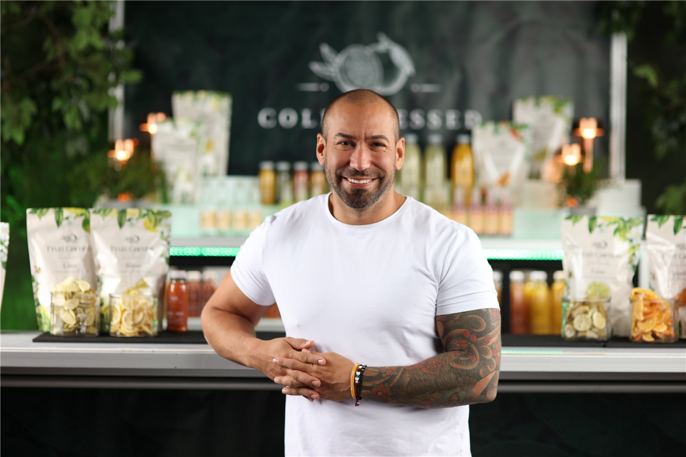 | Stort smil, tatuerad på hela vänsterarmen, brösten och höger sida (revben/rygg) |