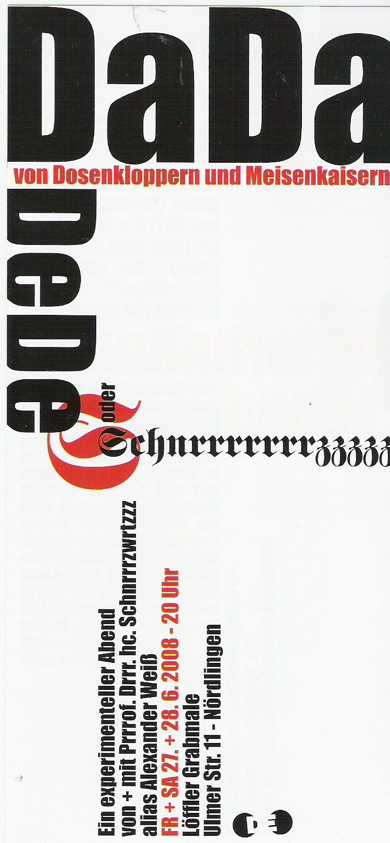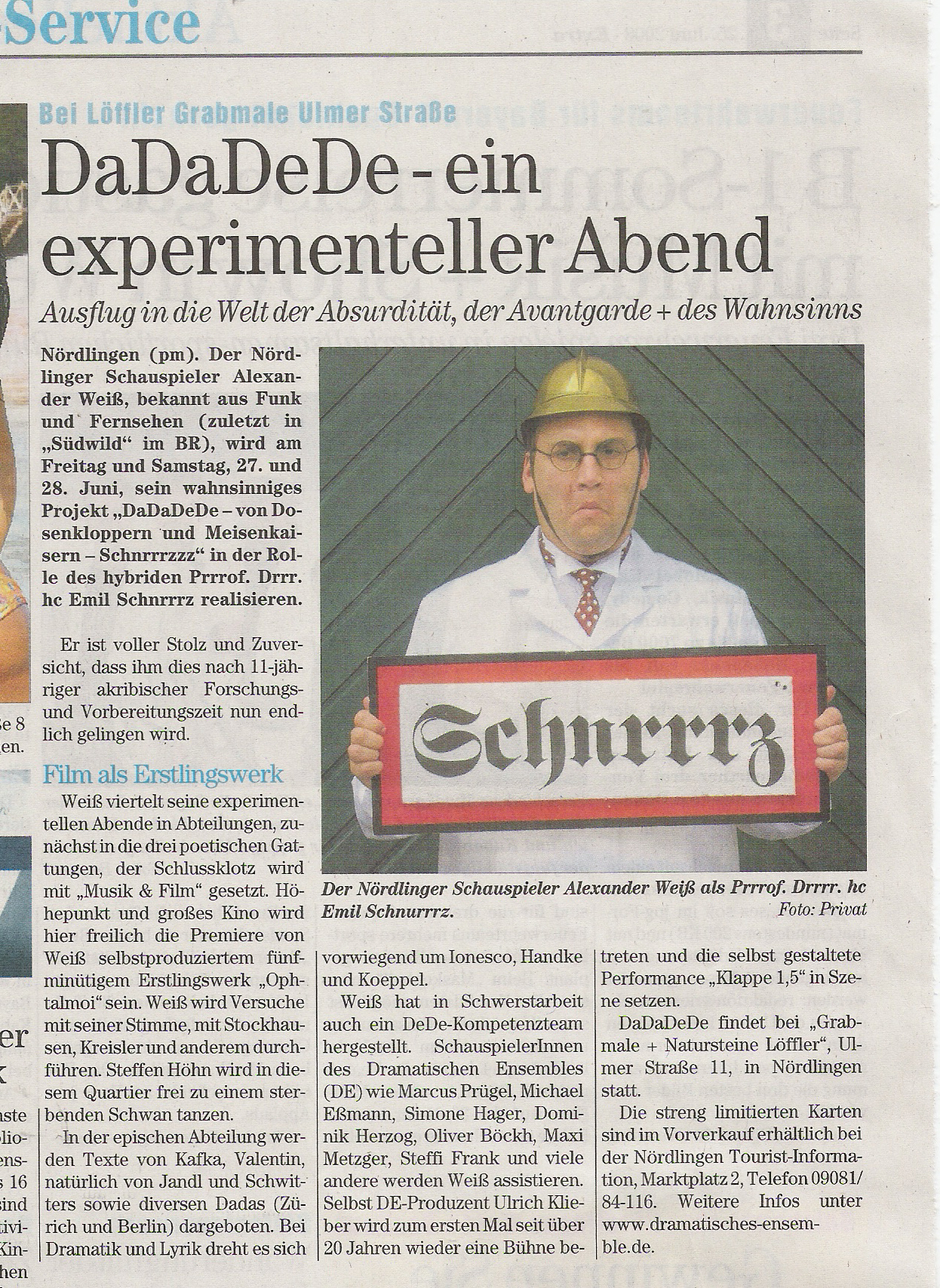 | Production DADADEDE | Employer / Theater Dramatisches Ensemble Nördlingen e.V. und Alexander Weiß | Part / Position Prrrof. Drrr. Drrr. Emil v. Schnrrrtznwrrrtz/ Regie & Produktion | Period 2008 |